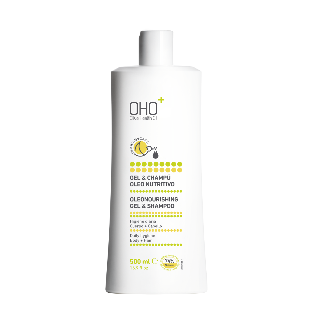 Solución suave diseñada con Aceite de Oliva OHO, glicerina, caléndula, alantoína y D-pantenol para la higiene diaria de la piel y el cabello de bebés y niños.